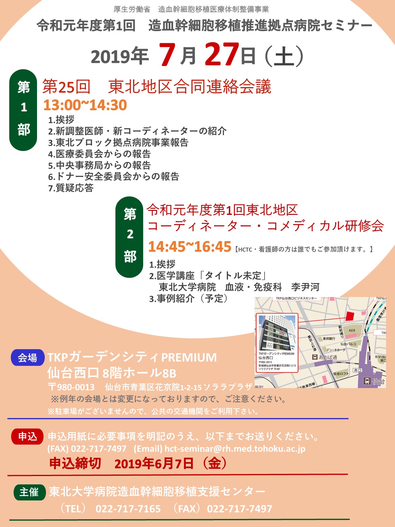 令和元年度第1回造血幹細胞移植推進拠点病院セミナー開催のお知らせ(2019/7/27開催)